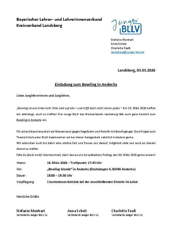 „Bowling ist wie Unterricht: Man zielt auf alle – und trifft doch nicht immer jeden.“ Am 18. März 2026 hoffen wir allerdings, euch zu treffen! Der Junge BLLV des Kreisverbands Landsberg lädt euch ganz herzlich zum Bowling in Andechs ein.